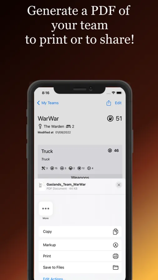 - Use your teams in game: Generate a PDF file from your team to Share or Print and Play!