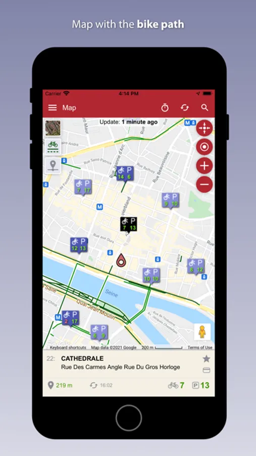 - Map of the city with the position of stations showing the number of bikes and the free stands for each station. It includes also the BIKE PATH.