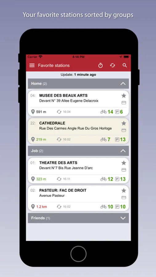 - List of favorite stations categorized by groups (home, work, friends or general).