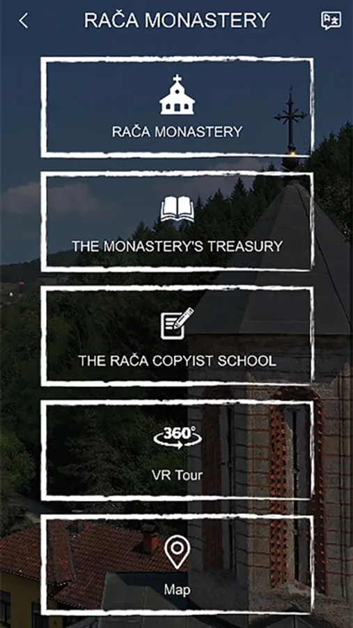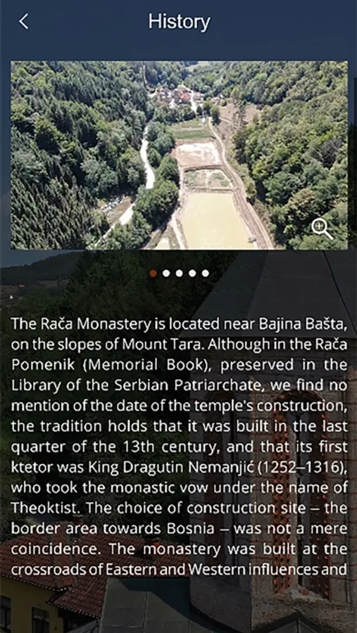 The application is a multilingual multimedia guide through the Rača Monastery. It contains video, rich photo galleries and 360 tour to give a more complete impression on the Rača Monastery.