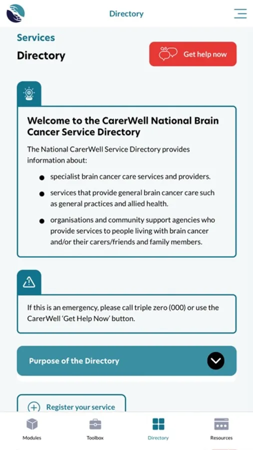 The app is a portal to high quality brain cancer resources, a service directory for relevant services in your area, a hub for finding out about the research from the CarerWell project, and a platform for a supportive care program. You can access the platform homepage without registering for the program, if that is what you’d prefer.