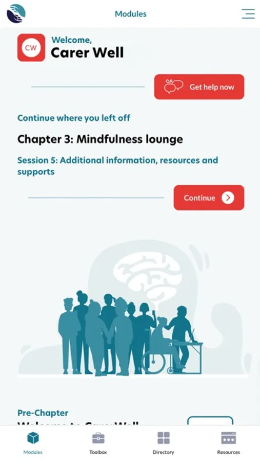 The CarerWell program offers support, guidance, and strategies for friends and family members of people with a primary brain tumour. It has one pre-chapter and then three chapters. Each chapter has five sessions, with some sessions longer than others.
