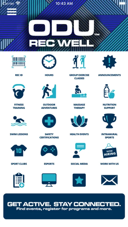 Be a Moving Monarch! Download the official app for ODU Recreation and Wellness to stay connected with Student Recreation Center hours and announcements, fitness programs, Intramural sports, and other recreational activities.