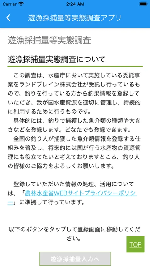 このアプリは、水産庁において実施している委託事業を弊社が受託し行っているもので、釣りを行っている方から釣果情報を登録していただき、我が国水産資源を適切に管理し、持続的に利用するために行うものです。
