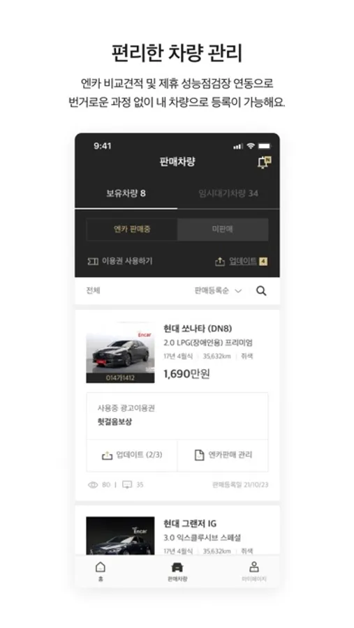 내가 엔카에서 판매중인 차량은 물론 비교견적을 통해 매입한 차량이나, 엠큐브 제휴 성능점검장 검사 차량까지 별도의 과정없이 한 눈에 확인할 수 있습니다.