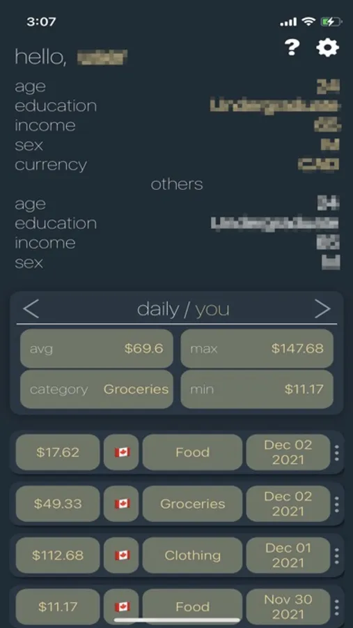 Through ingenious space-age algorithms, spenny will present you with the aggregated spending history of individuals of a specified sex, level of education, age, and income level.