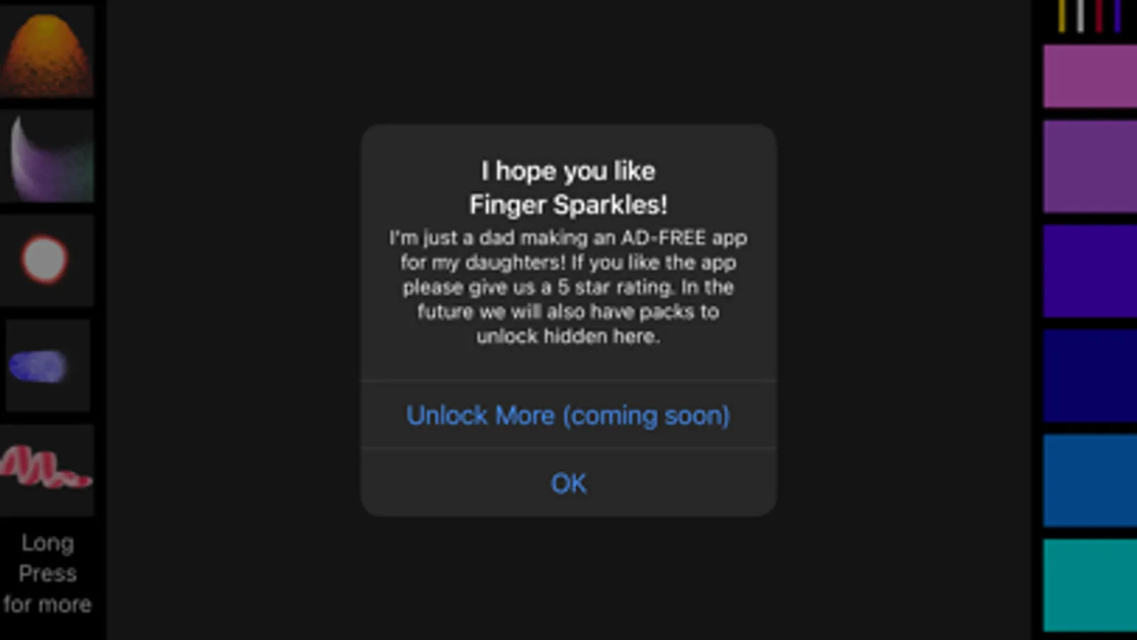 Finger Sparkles is a free and simple, ad-free app I made for my 1 year old daughter, additionally, my 9 year old daughter has reported that it is very satisfying! Finger Sparkles generates colorful particle effects as you drag your fingers across the screen. It's fun and mesmerizing for the whole family, allowing you to choose from a number of different particle FX and colors. (Also our cats sometimes like to touch the screen and play too!) We hope it is fun for you and your family!