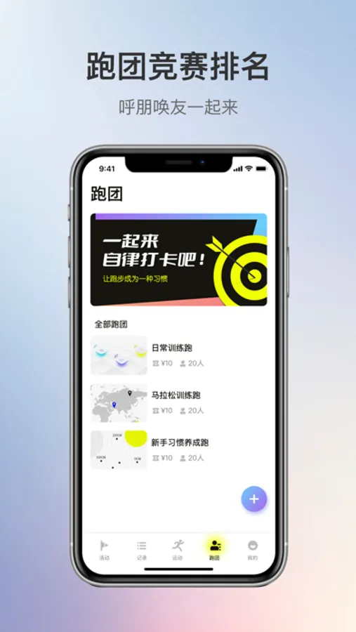 致力于打造熟人健身圈子,你可以创建专属跑团,邀请好友加入,和好友一起线上开跑,每日更新排名,健身的同时还满足社交需求。呼朋唤友大家一起来竞赛排名。想要的身材努力锻练,想要的生活自己争取。