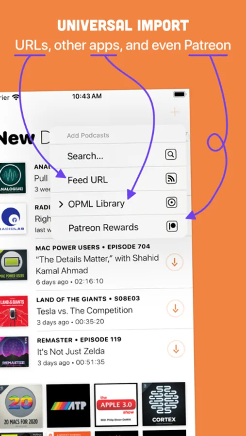 • Podcasts are updated and downloaded directly from source in the background