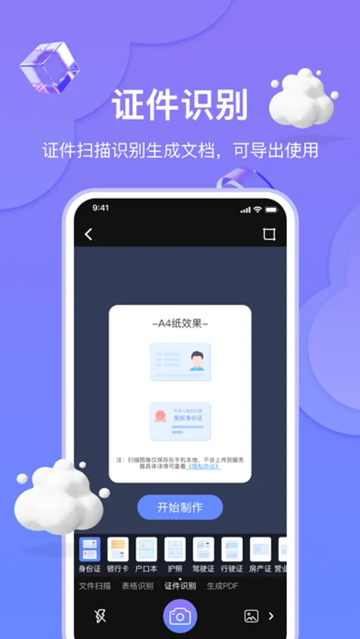 【证件扫描】支持身份证、银行卡、护照等各种证件识别扫描,生成电子复印件,添加水印;