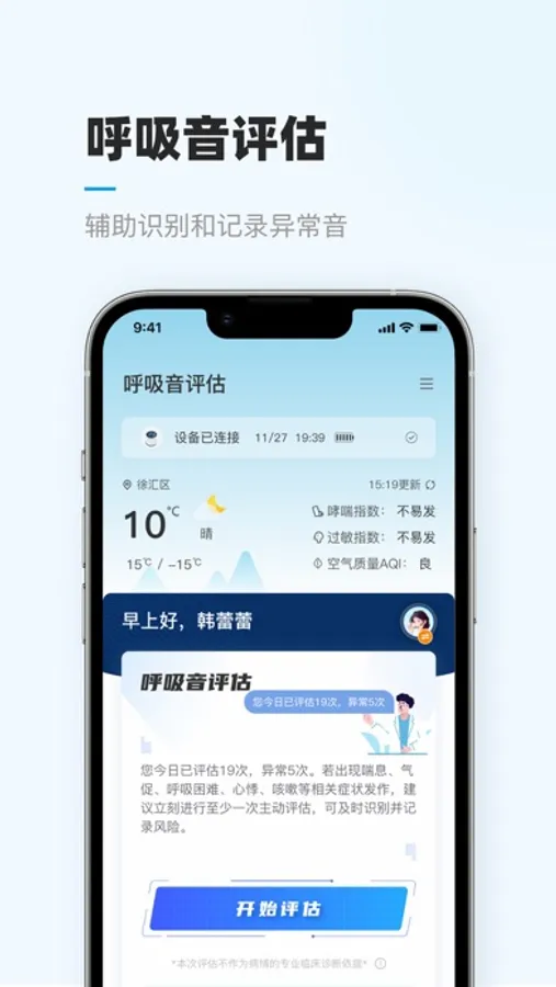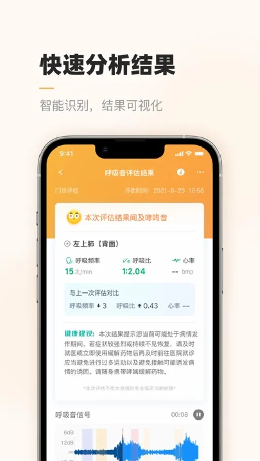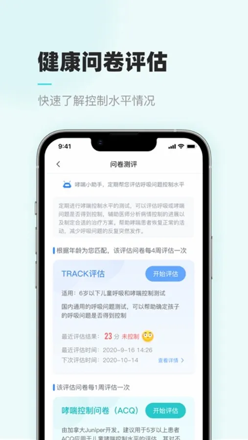 3、定期健康问卷评估,帮助用户和医生确定呼吸问题是否得到控制,辅助医师分析病情控制情况以便更好的治疗;