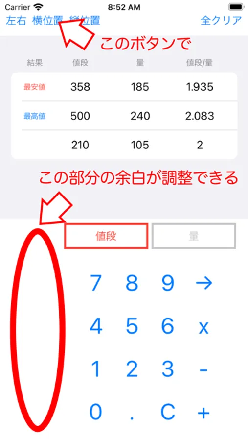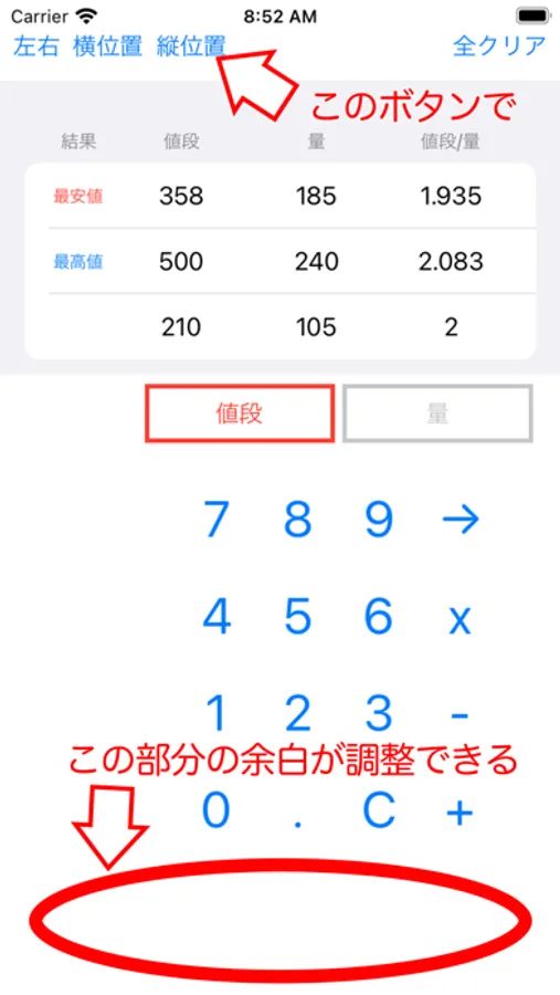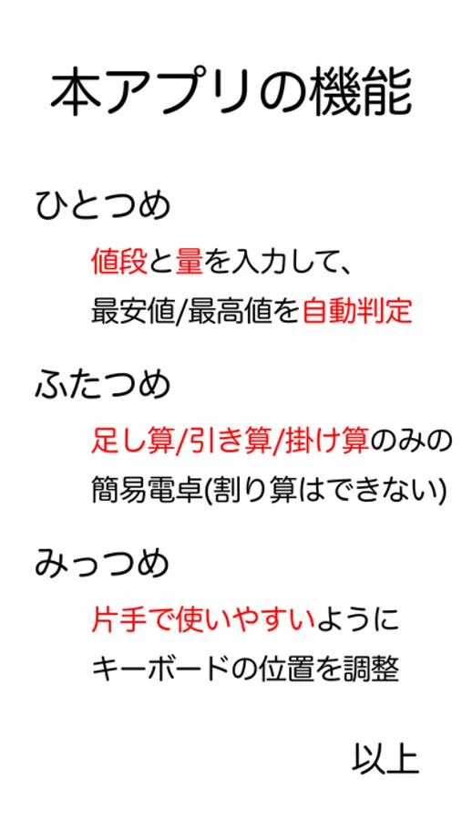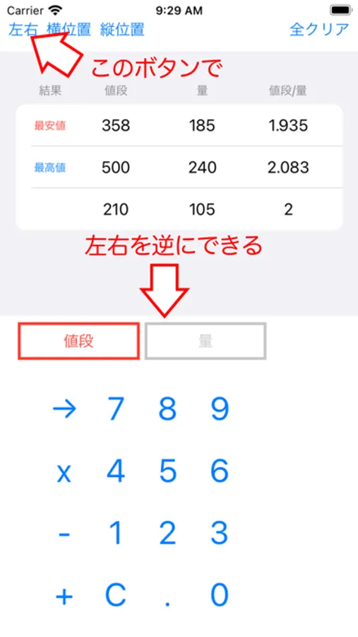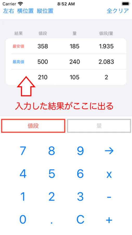 - 値段と量を入力すると複数の商品から最安値と最高値を自動で計算