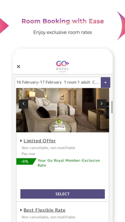 Go Royal mobile app also includes other convenient features such as checking points balance, redeeming rewards, receiving latest hotel promotions, enjoy hotel online services including room booking, table reservations, food takeaway / deliveries and e-Shop.
