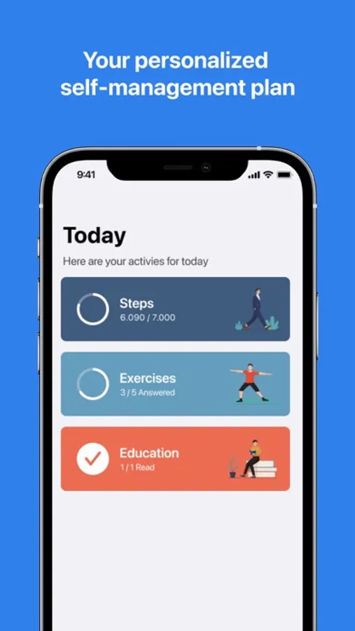 Your self-management consists of 3 main components; An exercise program with exercises specifically selected for you. Physical activity tracking, which is monitored through step activity, collected directly from your phone through Apple Health, together with educational content, so you can learn and understand your back pain.
