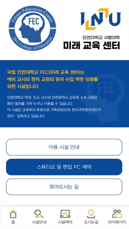 인천대학교 사범대학 미래교육센터에 구축된 영상 제작 시설을 예약하기 위한 앱입니다. 인천대학교 재학생, 교직원과 인천광역시 소속 현직 교원이 교육 콘텐츠 제작을 목적으로 이용할 수 있습니다.