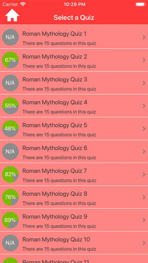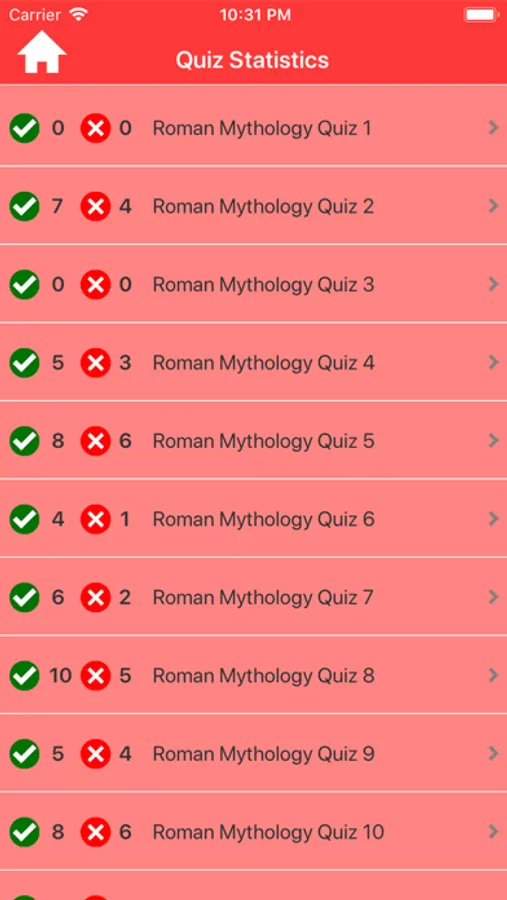 - You can review a quiz session performance details by selected a session. This screen shows quiz history performance reports.