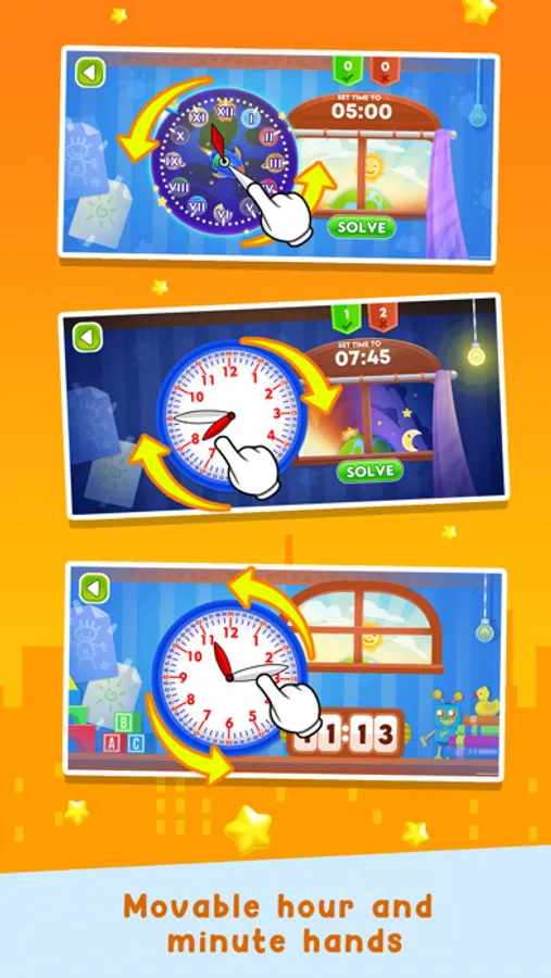 - Learn to set the time via Interactive clocks with movable hour and minute hands!