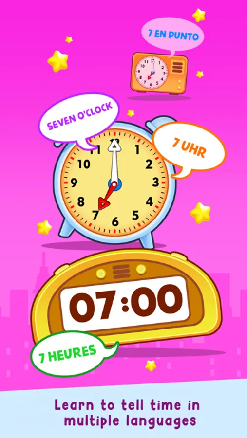 Telling Time Academy is available in multiple languages! All recorded by professional native speakers (English, French, Spanish, German).
