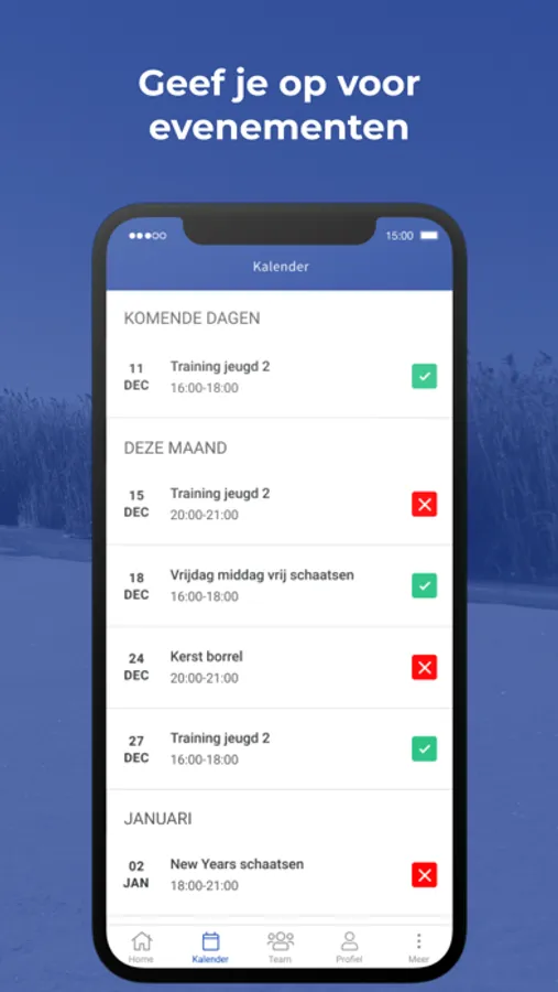 - Geef jouw aanwezigheid door voor wedstrijden, trainingen en evenementen.