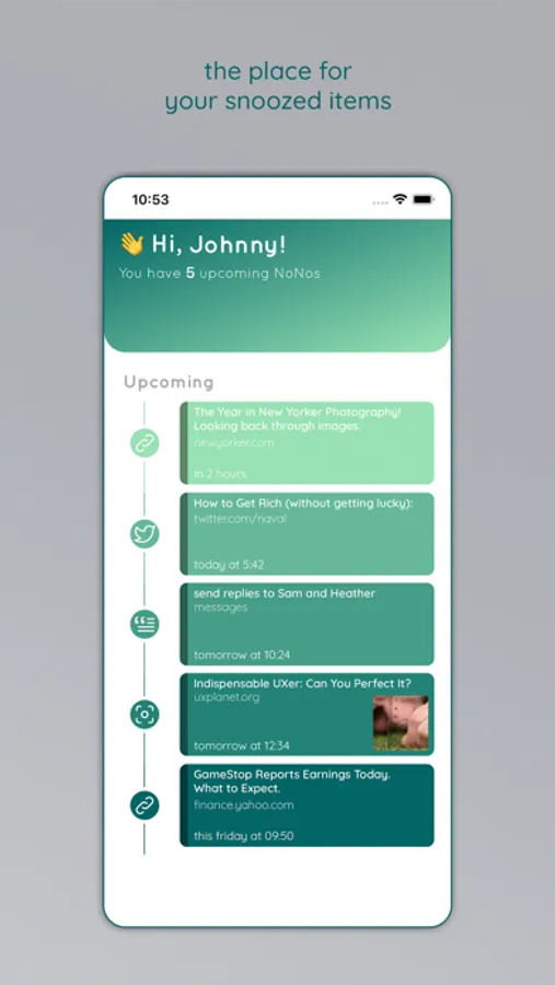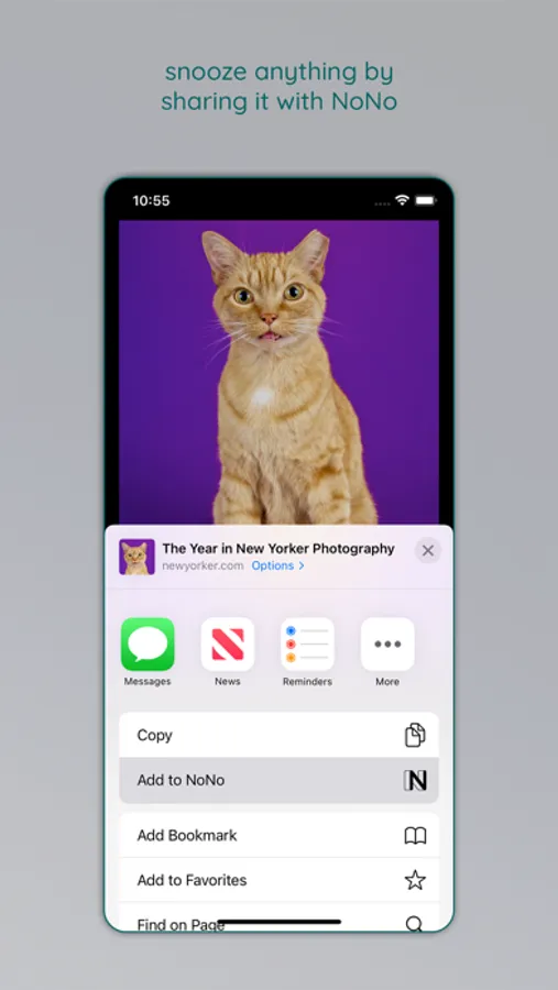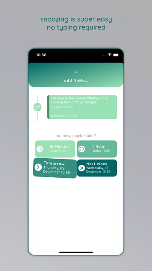 NoNo is the snooze button for your device. Share any content with the app to schedule a reminder.