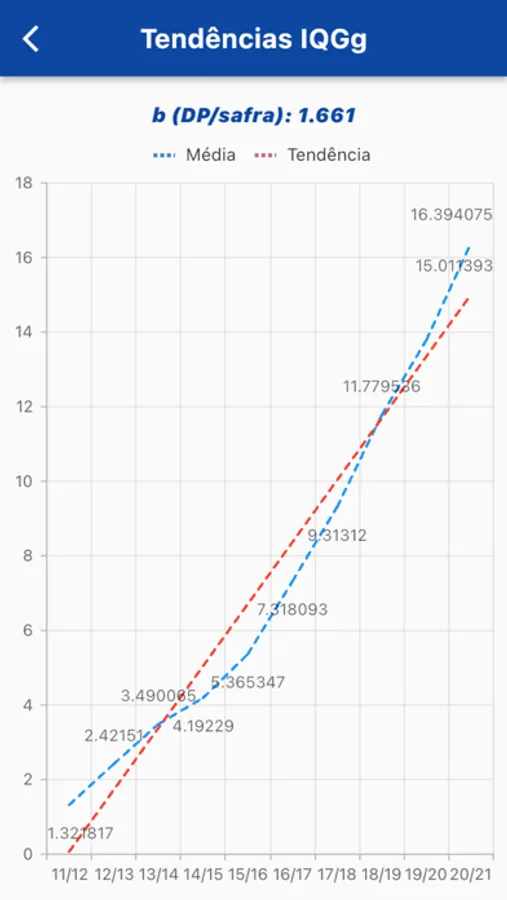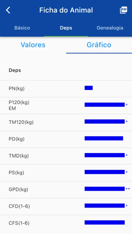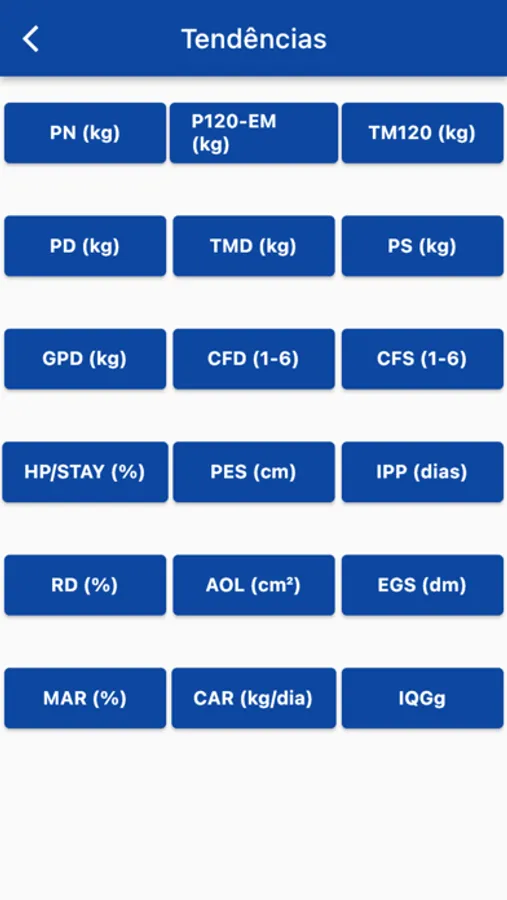 Encontram-se também disponíveis no aplicativo outras informações de caráter geral, tais como: valores médios para as diferentes características, médias das DEPs por safra e gráficos de tendências genéticas.