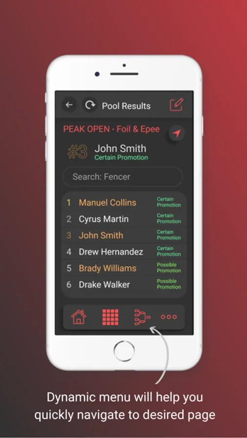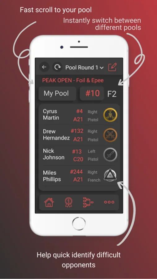 All combined within a single mobile application for ease of use and quick navigation that includes an adaptable navigation bar at the bottom to allow for instant movement between pools, DEs, final results, etc. from any screen.