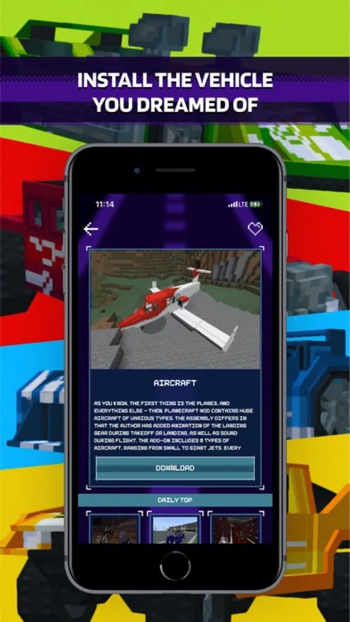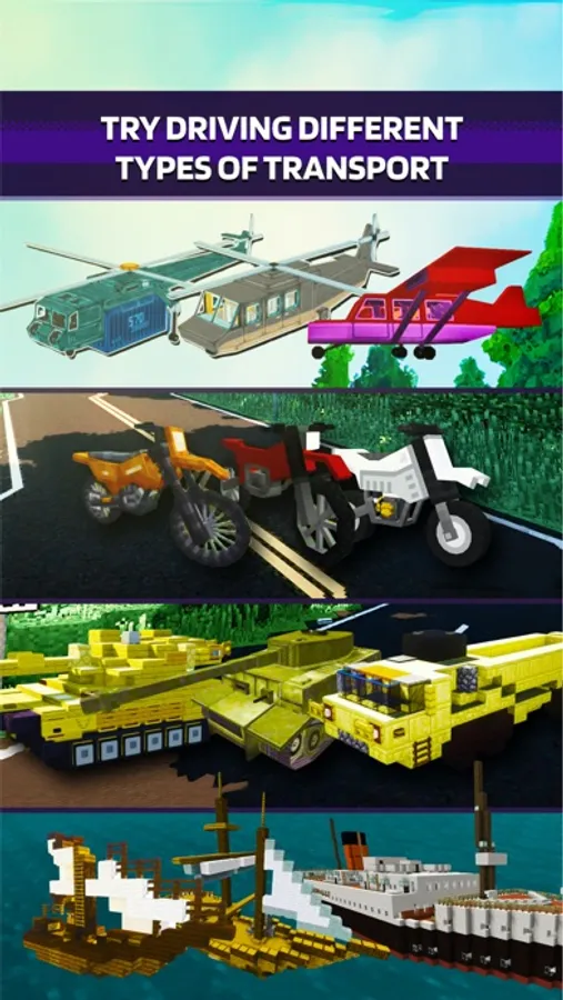 You will be the coolest in the pixel world because you will have a huge selection of cars! Try driving modern cars like BMW or Tesla, ride fast motorcycles through the city streets, or fly high in the sky on a huge plane. In addition, you have the opportunity to try controlling military vehicles like a tank or a helicopter. This will come in handy in survival mode!