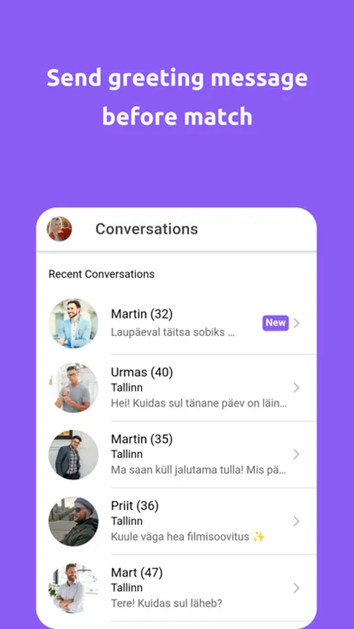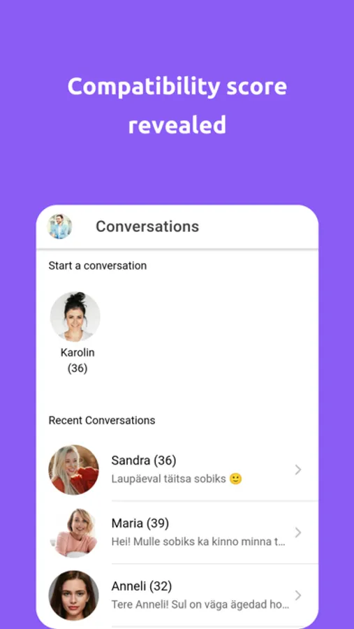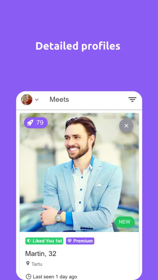 See other detailed profiles and compatibility score’s, so you can better understand who they are and confirm „Meets“. Send greeting message before match.