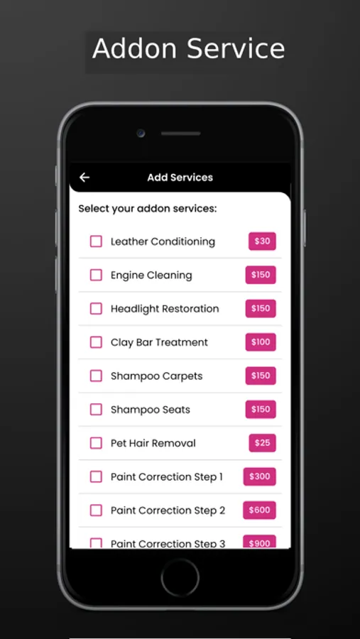 1- Select your car detailing service package, appointment date and time right online.