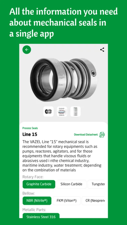 Application of Mechanical Seals of the Vazel brand, search and filter among all our products which is the best mechanical seal for your industry (you can search by type of material, by type of face, by size and even by temperature, scan the QR code that It comes in the box of your mechanical seal with the QR function of the application to download the technical sheet and installation manual of your mechanical seal.