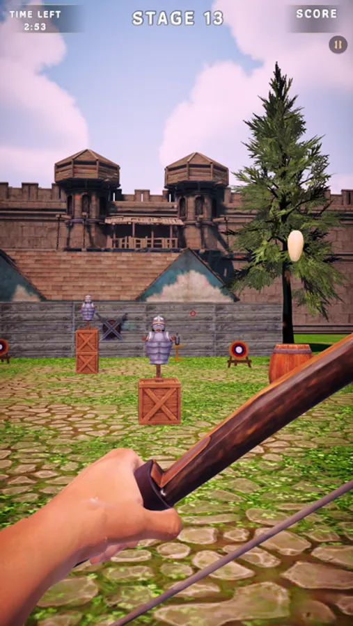 Variety of levels with various targets, from stationary where you have to hit the bullseye to get maximum points, to moving and exploding targets like fruits. Also the classic apple at the top of the head target.