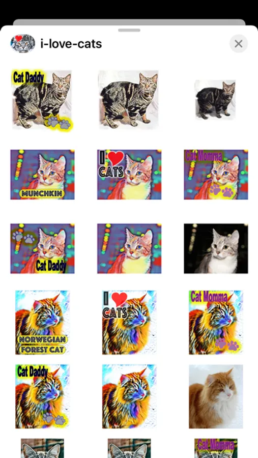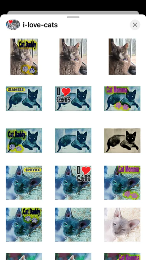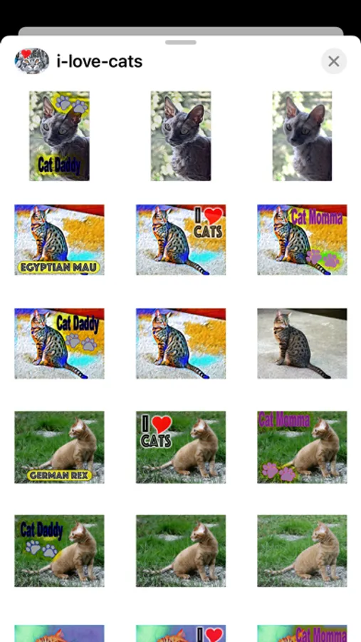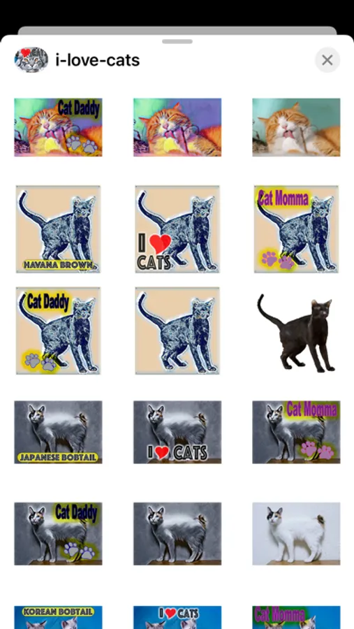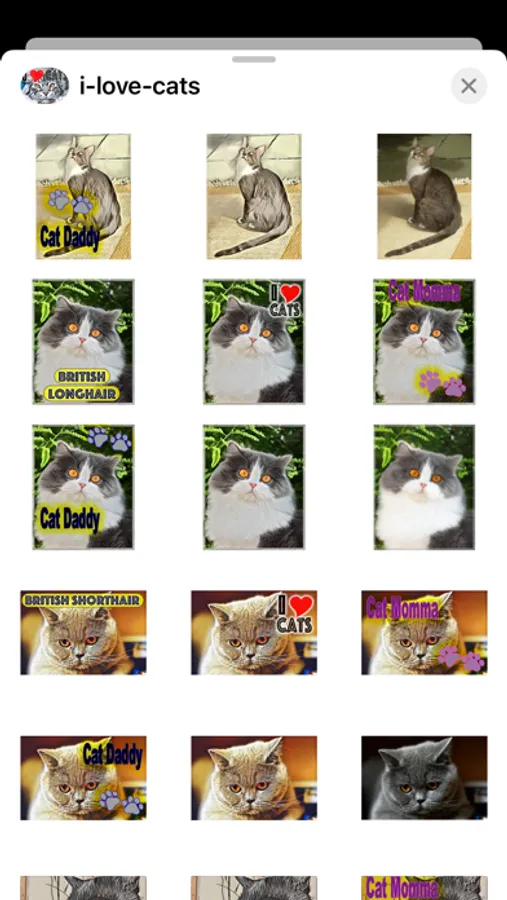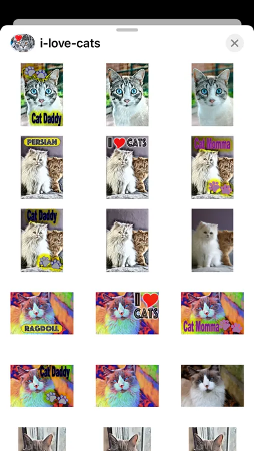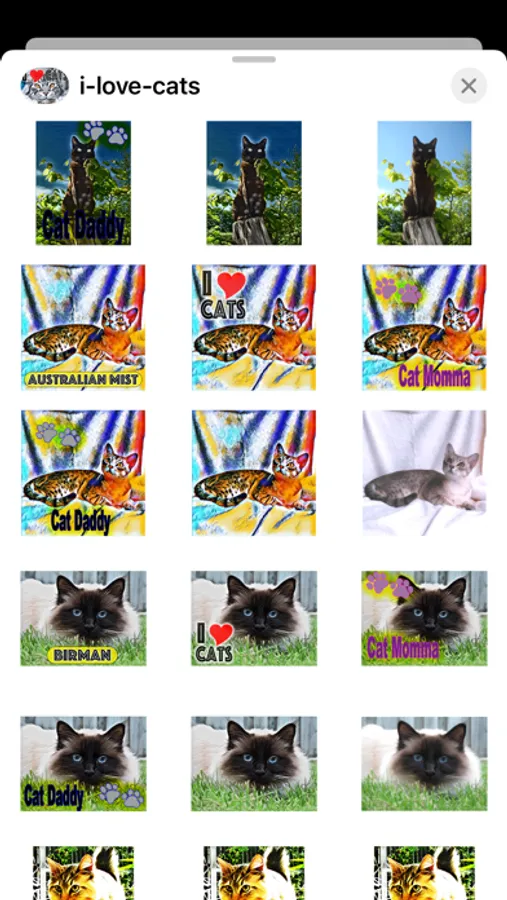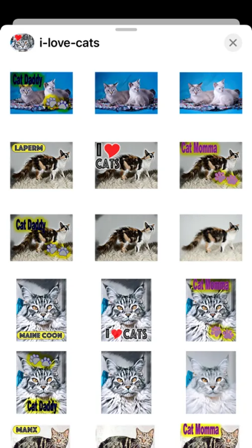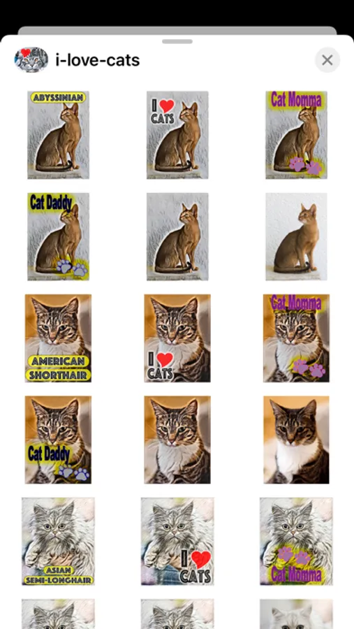 Share stickers of your favorite feline friends with someone in your life...or even send one to yourself! It's free and fun so download the "I Love Cats Sticker Pack" right now!