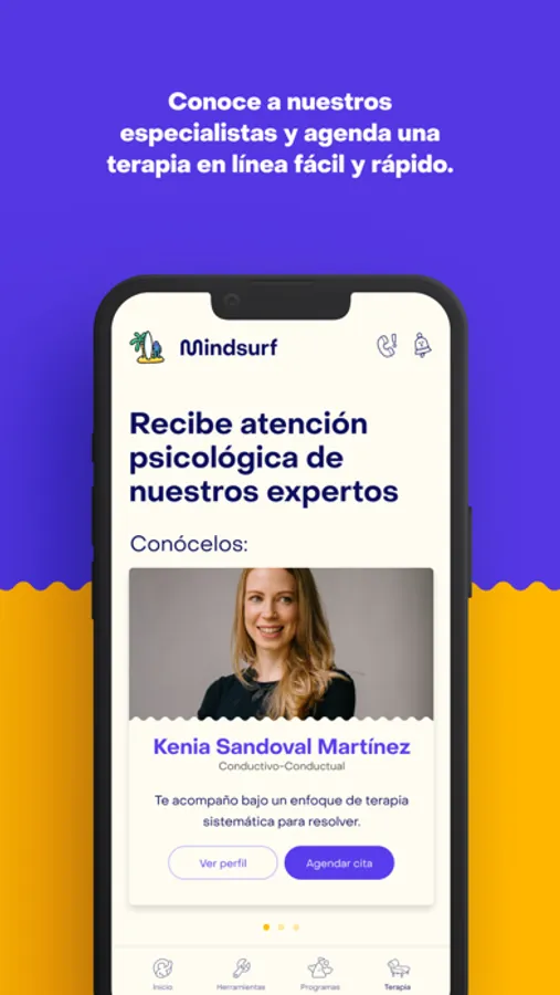 Pero no solo eso. Mindsurf también es una red de especialistas que estarán para ti. Sin traslados ni tiempo perdido en transporte: podrás tomar terapia en línea desde donde tú quieras y con el terapeuta que prefieras.