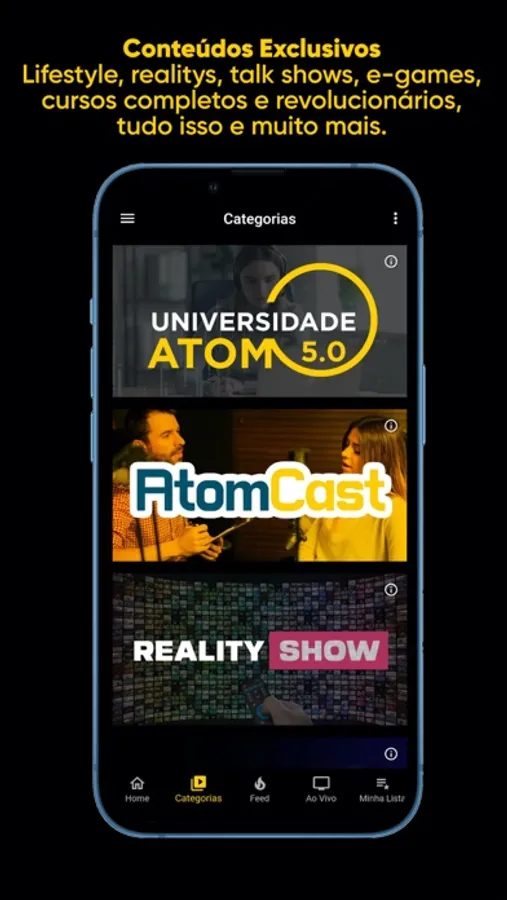No Atom TV tenha acesso a mais de 10 categorias exclusivas de entretenimento, como Realities, Lifestyle, Saúde Mental, Esportes, E-sports, acesso à programação AO VIVO de segunda à segunda e muito mais!