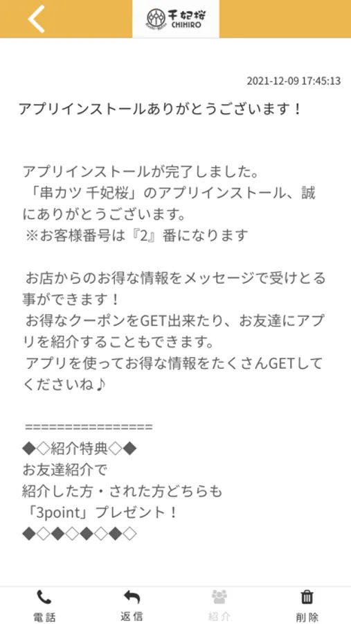 串カツ千妃桜のアプリをSNSを通じてお友達に紹介する事ができます。