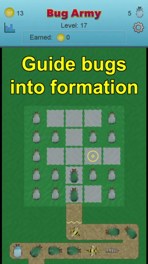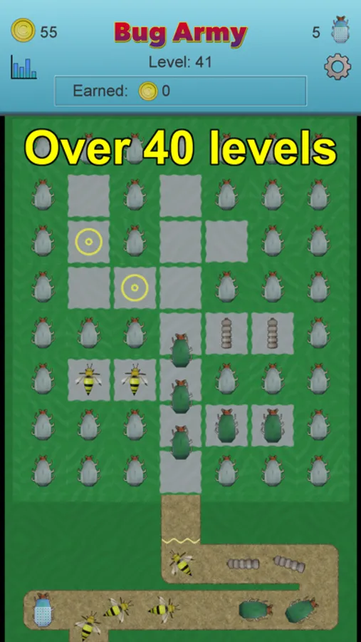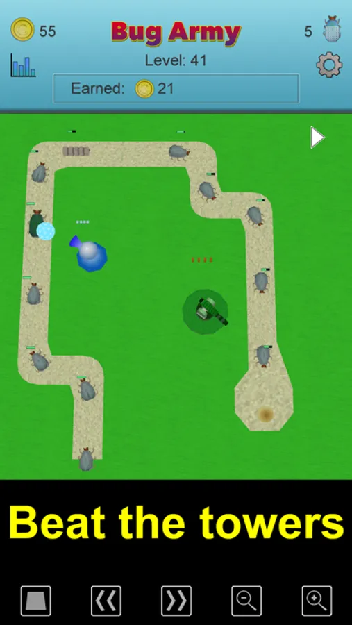 Each of the bugs have their own relative Speed, Health, Shell, and Push. And you can earn coins on each level and buy power-ups for each bug. Speed means how fast the bug can move past the towers. Health determines how many hits a bug can take. Shell is how much of a hit a bug can deflect. And Push is how much one bug will speed up the bug in front of them.