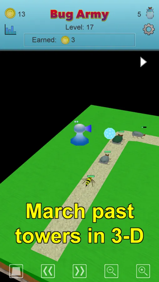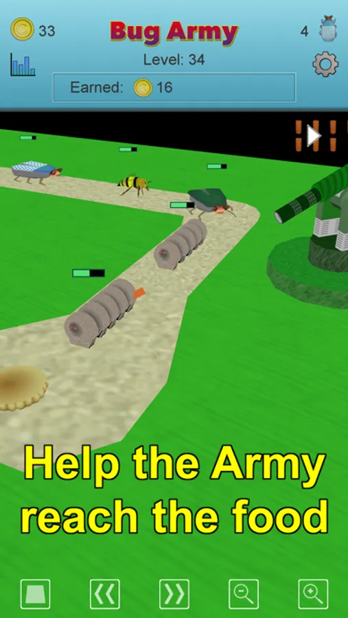The tower defense part of each level operates automatically. Change the camera angle to watch your Bug Army reach the food.