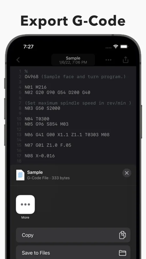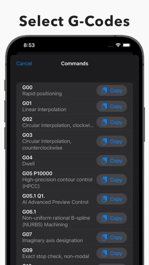 Edit machine code for CNC and lathe machines. Browse, and select G-Codes and M-Codes using the provided command list.