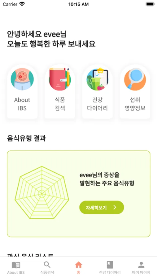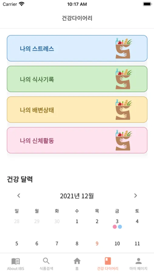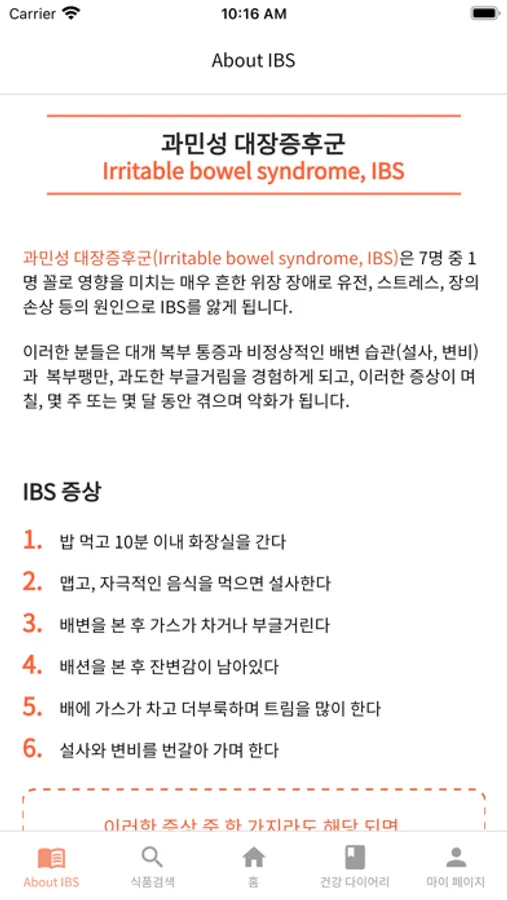 과민성 장증후군 환자를 위한 음식, 식품정보를 제공하며, 자신이 섭취한 음식, 증상, 스트레스, 활동 정도를 다이어리에 기록할 수 있습니다. 이 기록 정보를 토대로 어떤 음식을 먹었을 때 증상이 나타날 수 있을 지 예측하는 데 도움을 주고, 영양전문가와 직접 연결도 가능합니다.
