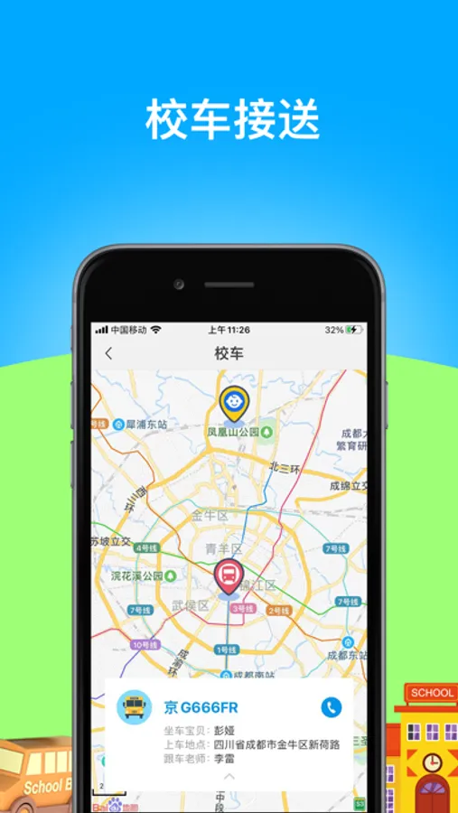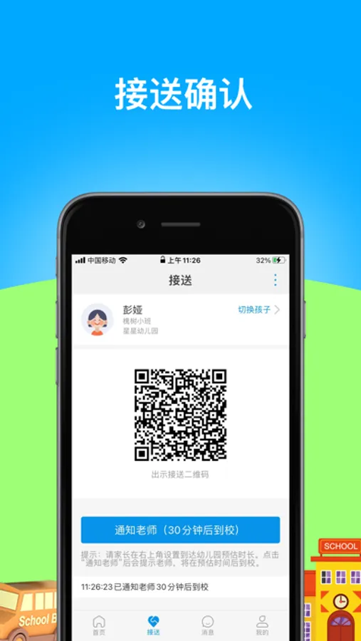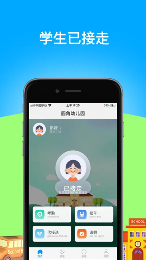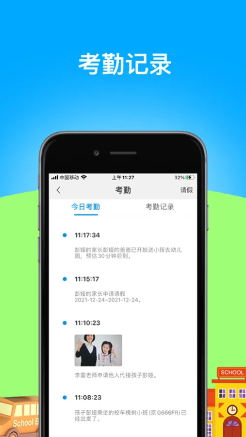 校车接送提醒功能负责接送的教师算好校车到达接、送孩子地点,一键提醒家长提前到达指定的接送地点,解决由于路上堵车,家长站在路边长时间等待的烦恼问题。