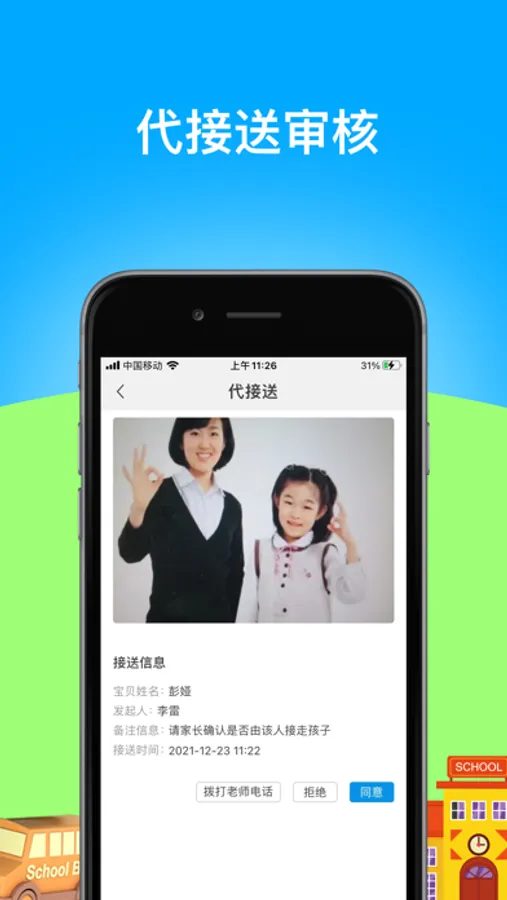 支持多人接送,接送信息实时推送,班级呼叫、接送有序,接送人照片实时上传,安全可靠,家长更放心。平时接送儿童,家人会通过电话信息沟通来接送孩子。这款APP,提前将负责接送孩子的家人信息录入系统,谁去接孩子一键点击,其他责任家长打开APP即可第一时间显示谁将去接送孩子的消息了。同时也实现了家长就近接送的方便。