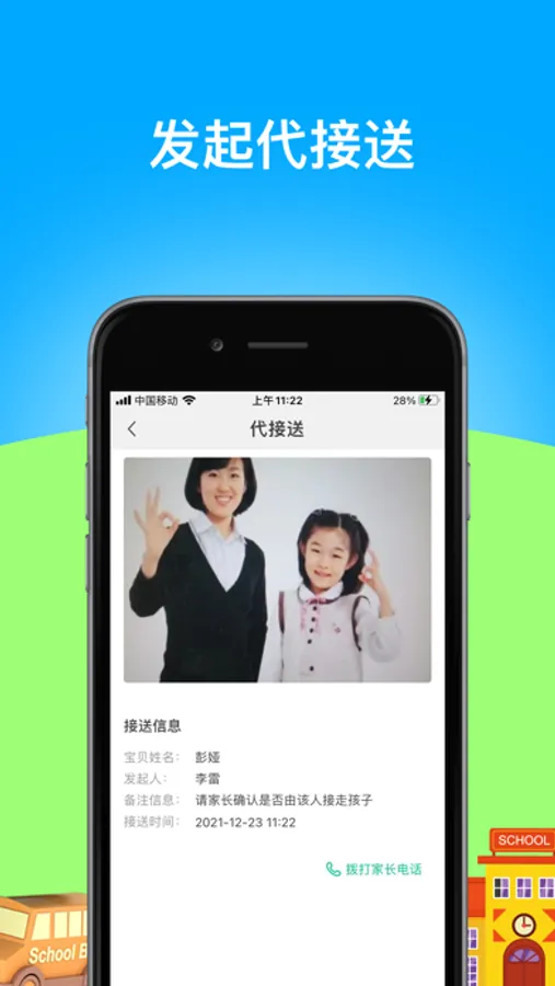 支持多人接送,接送信息实时推送,班级呼叫、接送有序,接送人照片实时上传,安全可靠,家长更放心。平时接送儿童,家人会通过电话信息沟通来接送孩子。这款APP,提前将负责接送孩子的家人信息录入系统,谁去接孩子一键点击,其他责任家长打开APP即可第一时间显示谁将去接送孩子的消息了。同时也实现了家长就近接送的方便。