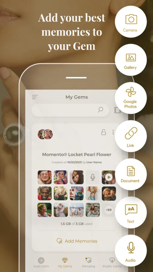 Declare your love, create memories and give a voice to your Momento™ jewelry with the Momento app. Designed to be used in conjunction with the Momento™ Pearl, Mometo™ Gem and Momento™ Diamond Collections, this app utilizes the NFC technology in your iOS device to turn fine jewelry into a true keepsake. Save your voice messages, text messages, images and video links using your iPhone 7, iPhone 7 Plus, iPhone 8, iPhone 8 Plus or iPhone X with the Momento app and keep your precious memories until the end of time.