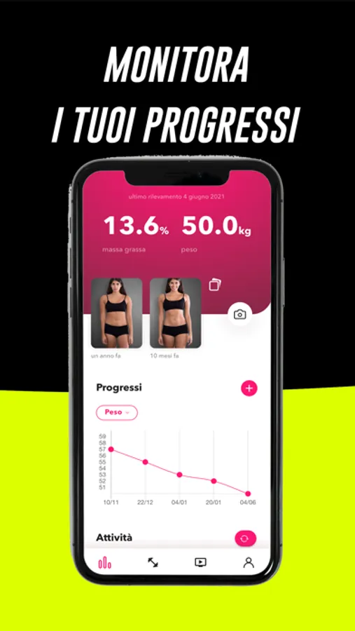 Avrai sempre sotto controllo la tua attività fisica: potrai visualizzare quali esercizi sono previsti nel tuo piano di allenamento, i tuoi progressi e come cambia il tuo fisico nel corso del tempo.