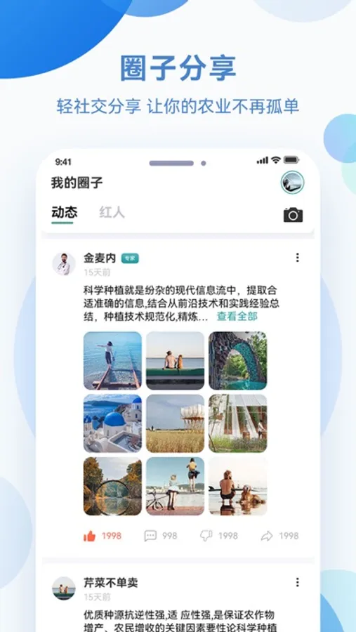 化浪农业APP建立了完善的农业服务链条,可提供丰富的农化类增值服务,如农业包采、土地转让、租赁、智能监测、农业旅游、作物交易等服务。同时为农户提供以作物为单位的作物医院,提供专家语音视频、现场指导,充分满足农户实际需求。更有圈子功能,可提供农户间技术、经验交流。
