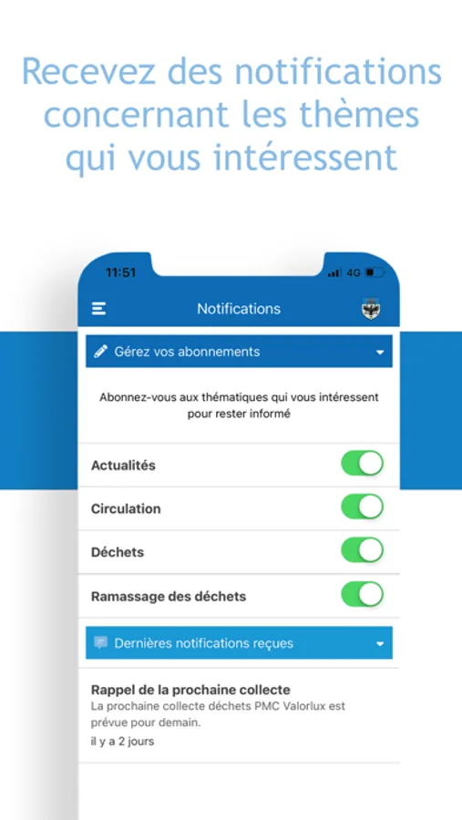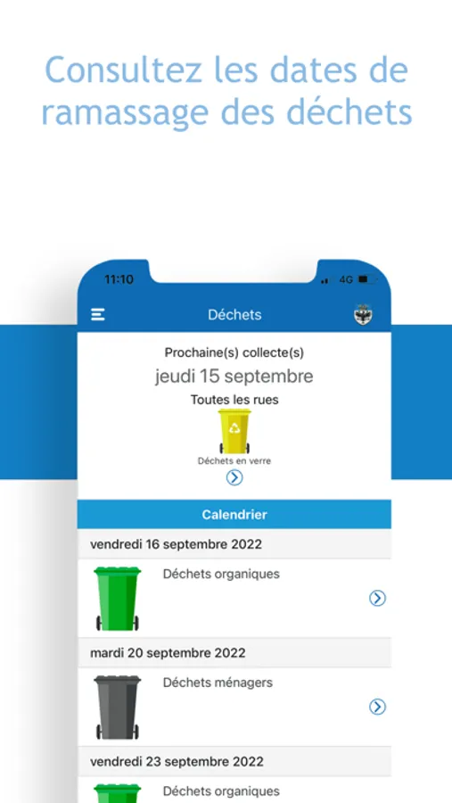 - Accédez aux dates des ramassages des déchets et recevez une notification pour vous rappeler de sortir les poubelles