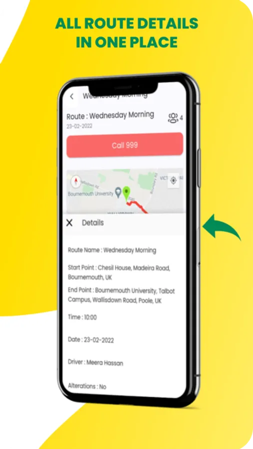 -Route notifications show the start and end stops, any mid-route stops, a route map, time, date and the driver