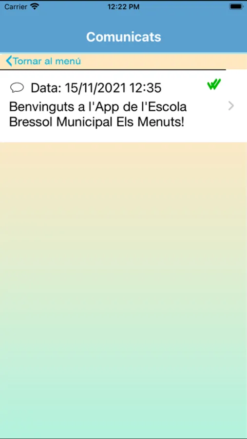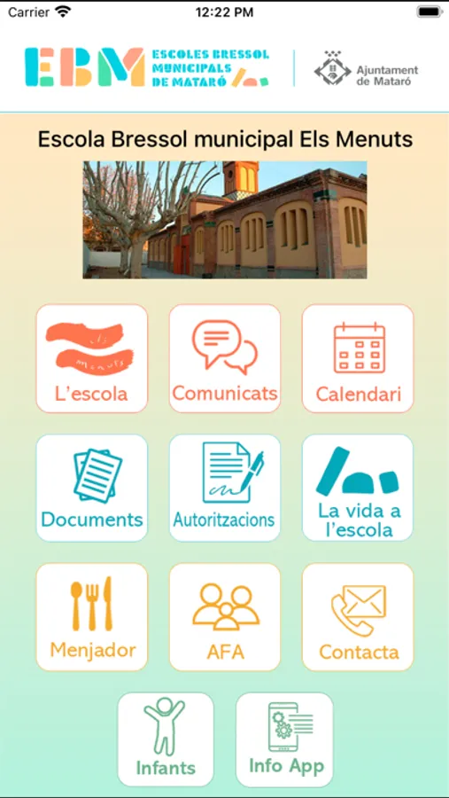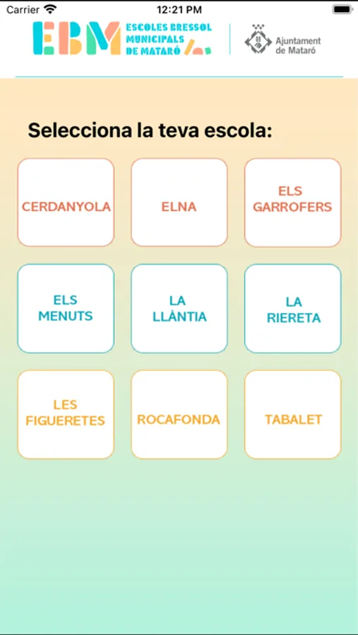 APP de les Escoles Bressol Municipals de Mataró. L'aplicació permet una comunicació directa entre el centre i els pares o tutors dels infants. Consta d'una primera pantalla de registre on tires el centre i s'identifica l'usuari. Un cop validat, al menú principal de l'APP apareixen diverses seccions: "L'escola" amb informació de les dades de l'escola, "Comunicats" enviats per l'escola -siguin comunicats generals o personalitzats-, "Calendari" amb una agenda de les activitats de l'escola, "Documents" facilitats per l'escola, "Autoritzacions", "La vida a l'escola" amb informació de les activitats que es van realitzant a l'escola, "Menjador" amb la informació relativa al servei de menjador, secció "AFA" i "Contacta" amb un formulari de contacte.