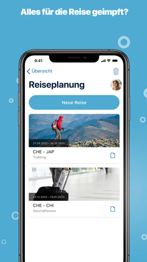 Wenn Sie verreisen möchten, werden Sie mit ImpfPassCH Plus für alle Länder dieser Erde über notwendige Reiseimpfungen informiert*. Sie können auch wählen, ob Sie einen Badeurlaub, eine Trekkingreise oder einen Langzeitaufenthalt planen. Die Impfungen werden für Sie und alle Familienmitglieder angezeigt, die Sie in die Reise einbeziehen.