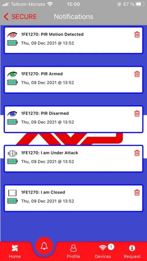 The AVP SECURE app ensures that the user is notified, in Real-Time, of any Alarm event that is sent from a remote AVP SECURE device.